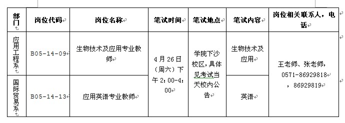 应用工程系生物技术及应用专业教师(B05-14-09)岗位和国际贸易系应用英语专业教师(B05-14-13)岗位因通过资格审查人数较多,按照公告要求,须先行进行笔试,笔试前5名进入试讲环节,笔试、试讲和面试分别则按30%、40%、30%计入总成绩。其余岗位无须参加笔试,直接进入试讲环节。试讲、面试成绩分别占总成绩的40%和60%。