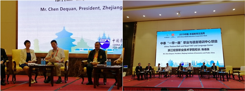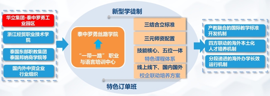 2019年,学校成功入选“‘中国—东盟’双百职校强强合作旗舰计划”建设单位,“一带一路”职业与语言培训中心项目荣获第二批“中国-东盟高职院校特色项目”,泰中罗勇丝路学院获批“浙江省首批‘一带一路’丝路学院建设计划”。2021年,“‘一带一路’植教入企:中企本土化班组长培养模式的探索与实践”融合浙江省教学成果奖二等奖。合作企业先后担任“泰国中国企业总商会罗勇商会理会”“泰国中国企业总商会橡胶行业协会”会长单位并荣获“2020中国走进东盟成功企业奖”。企业国际化运营水平得到了中泰两国领导人的认可与重视,共和国国务院、国家发改委、商务部、中国驻泰国大使、浙江省委、泰国各级政府等领导多次莅临指导。泰国副僧王颂德通猜与前副总理素贴称赞此项目“示范引领了两国职教合作,切实促进了民心相通、福祉相依”。
