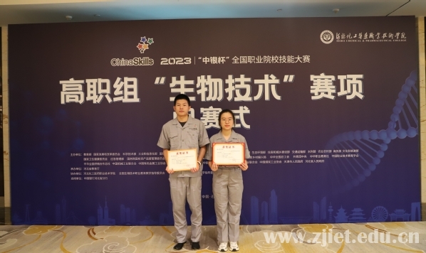 8月24-27日,2023年全国职业院校技能大赛高职组“生物技术”赛项在河北化工医院职业技术学院举行,来自全国28个省(自治区、直辖市)的53支参赛队,共计106名选手参加。我校应用工程学院食品检验检测技术专业群学生尤锡健、杨题铭组成的浙江省代表队荣获了团体二等奖。